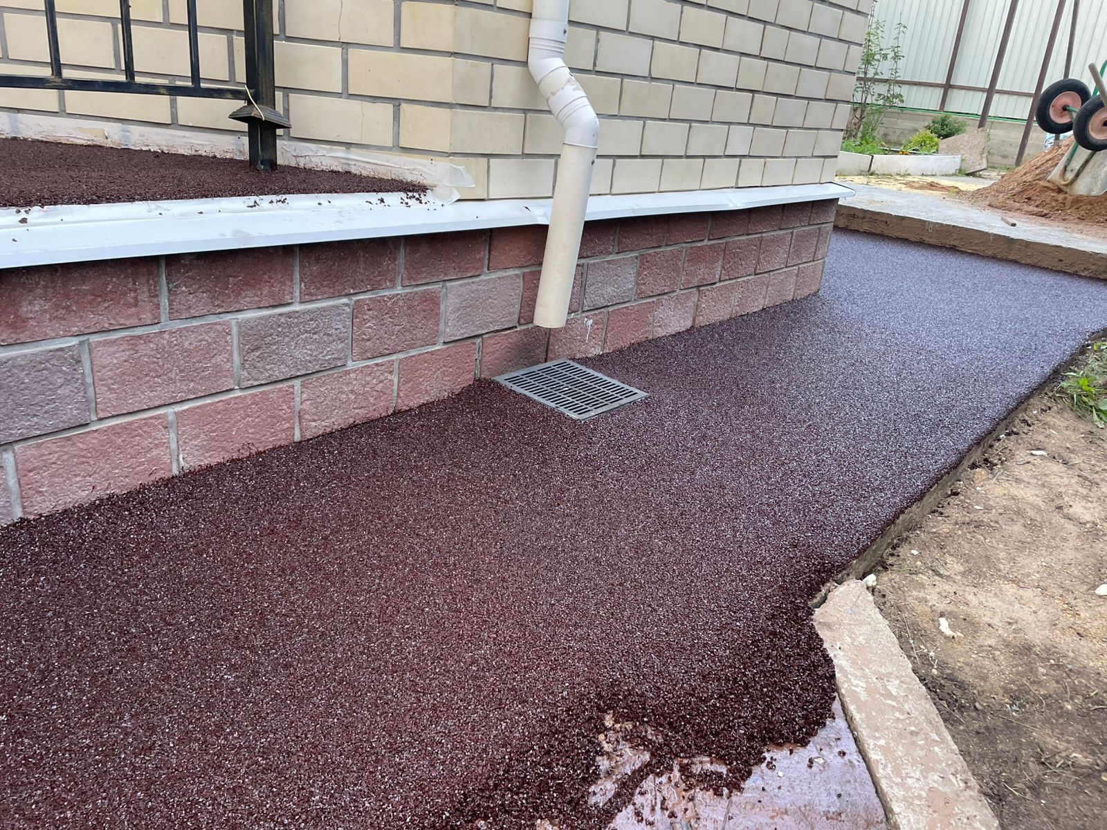 Технология: смесь резиновой крошки (фракция 2–4 мм), пигмента и связующего наносят и выравнивают.